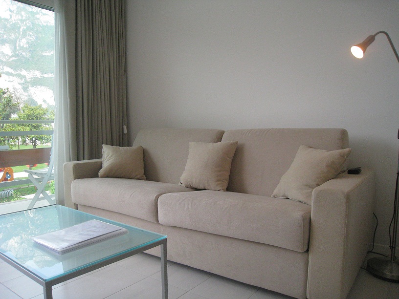 Situato al primo piano, dispone di un balcone (ca. 10 mq) vista lago arredato con tavolo e sedie, una zona giorno con divano letto per due persone, angolo cottura corredato di tutta l’attrezzatura necessaria, completa di frigorifero, lavastoviglie e forno microonde, 1 bagno con doccia/wc. L’appartamento è dotato di aria condizionata, riscaldamento, TV sat LCD, radio/lettore cd.